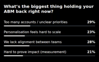 The session also covered the challenges of ABM, such as low impact, slow pipelines, and lack of strategic clarity, and the need for precision, orchestration, and technology to achieve real results. Jones launched a poll to understand the biggest challenges holding attendees’ ABM strategy back, with results showing that too many accounts, unclear priorities, and personalisation challenges are common issues.